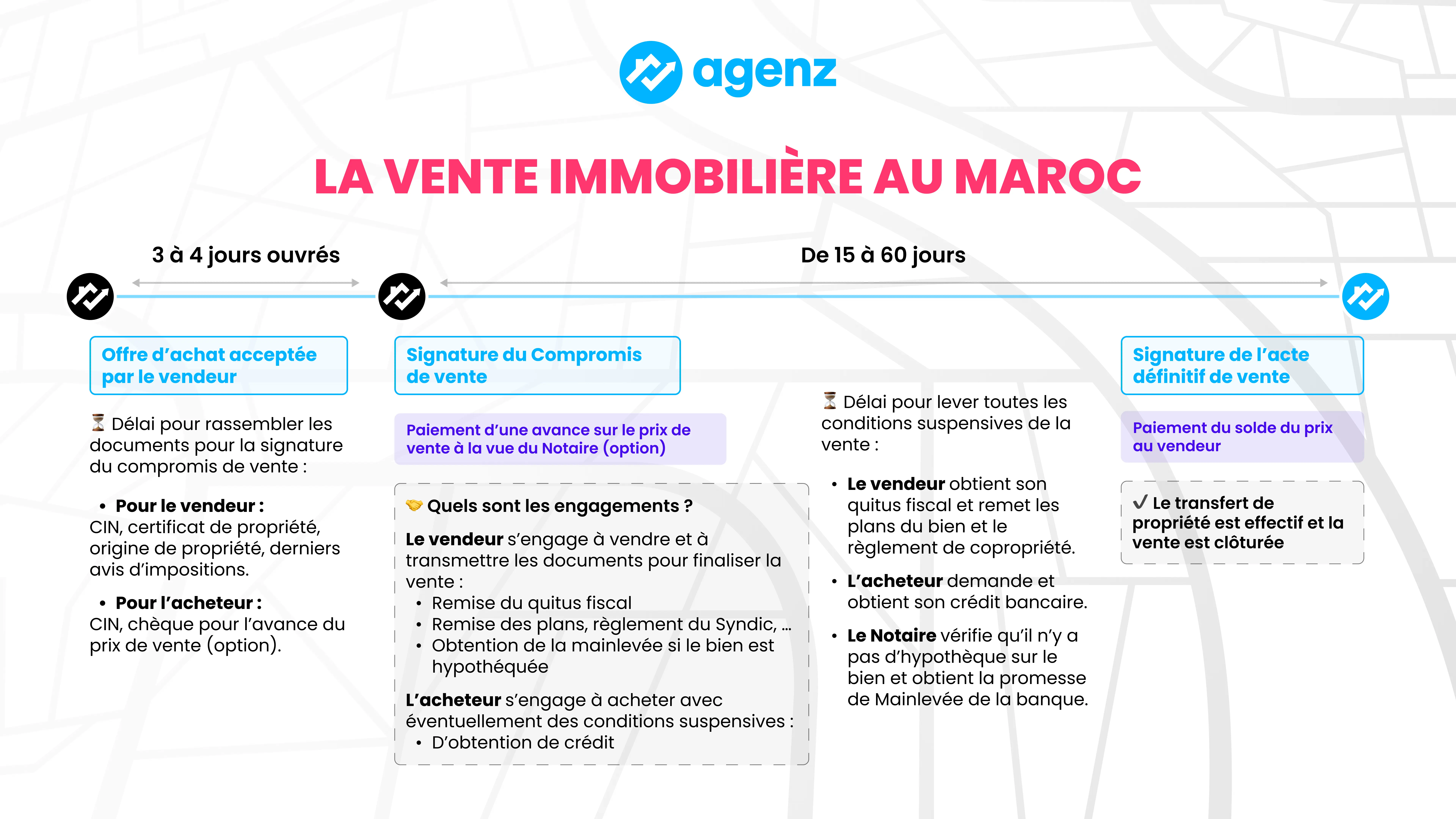 En conclusion, l'infographie décompose méthodiquement les phases de la transaction immobilière au Maroc, en soulignant les responsabilités et les documents requis pour les parties impliquées, depuis l'acceptation de l'offre jusqu'à la finalisation de la vente. Elle éclaire le chemin qu'empruntent vendeurs et acheteurs, encadrés par l'expertise d'un notaire, pour mener à bien la cession d'un bien immobilier dans les délais impartis.
